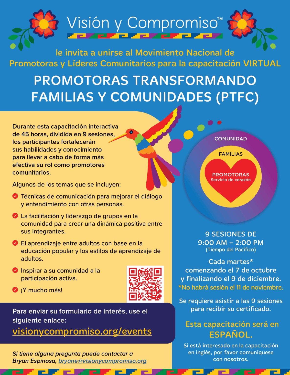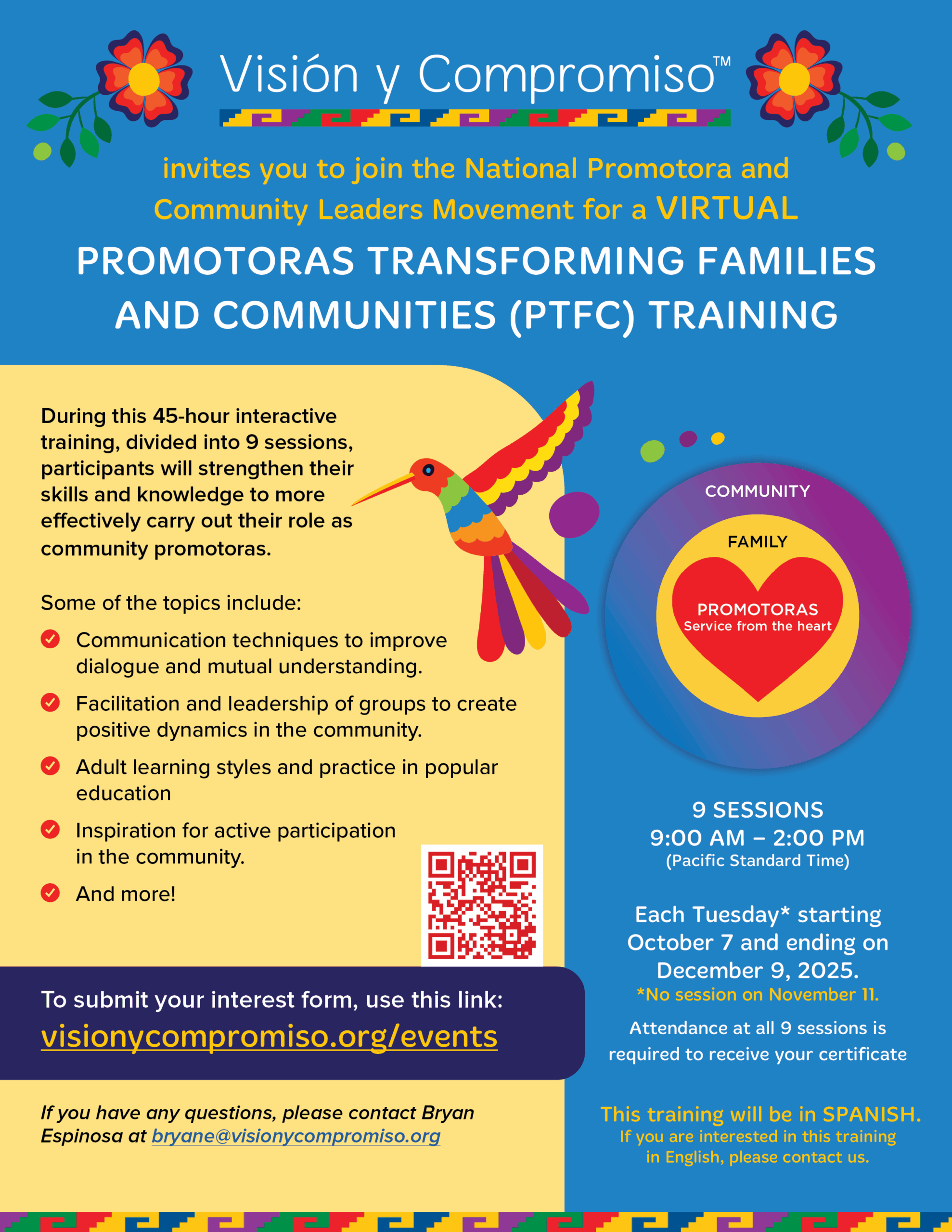 PROMOTORAS TRANSFORMING FAMILIES AND COMMUNITIES TRAINING: This training by Vision y Compromiso will be offered in Spanish. See the flyer in English and the flyer in Spanish .
