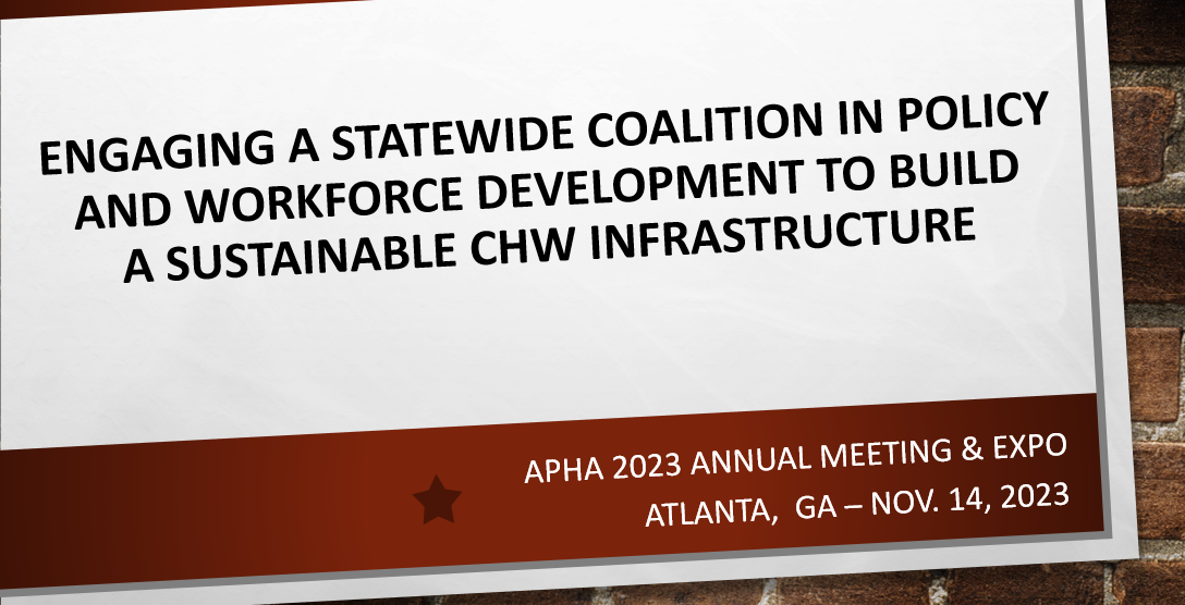 Cooper-Real R, Billings C, Oliver-Marick M, Reinschmidt KM. Engaging a statewide coalition in policy and workforce development to build a sustainable CHW infrastructure. APHA 2023 Annual Meeting & Expo. Atlanta, GA, Nov. 12-15, 2023. (Oral Presentation)